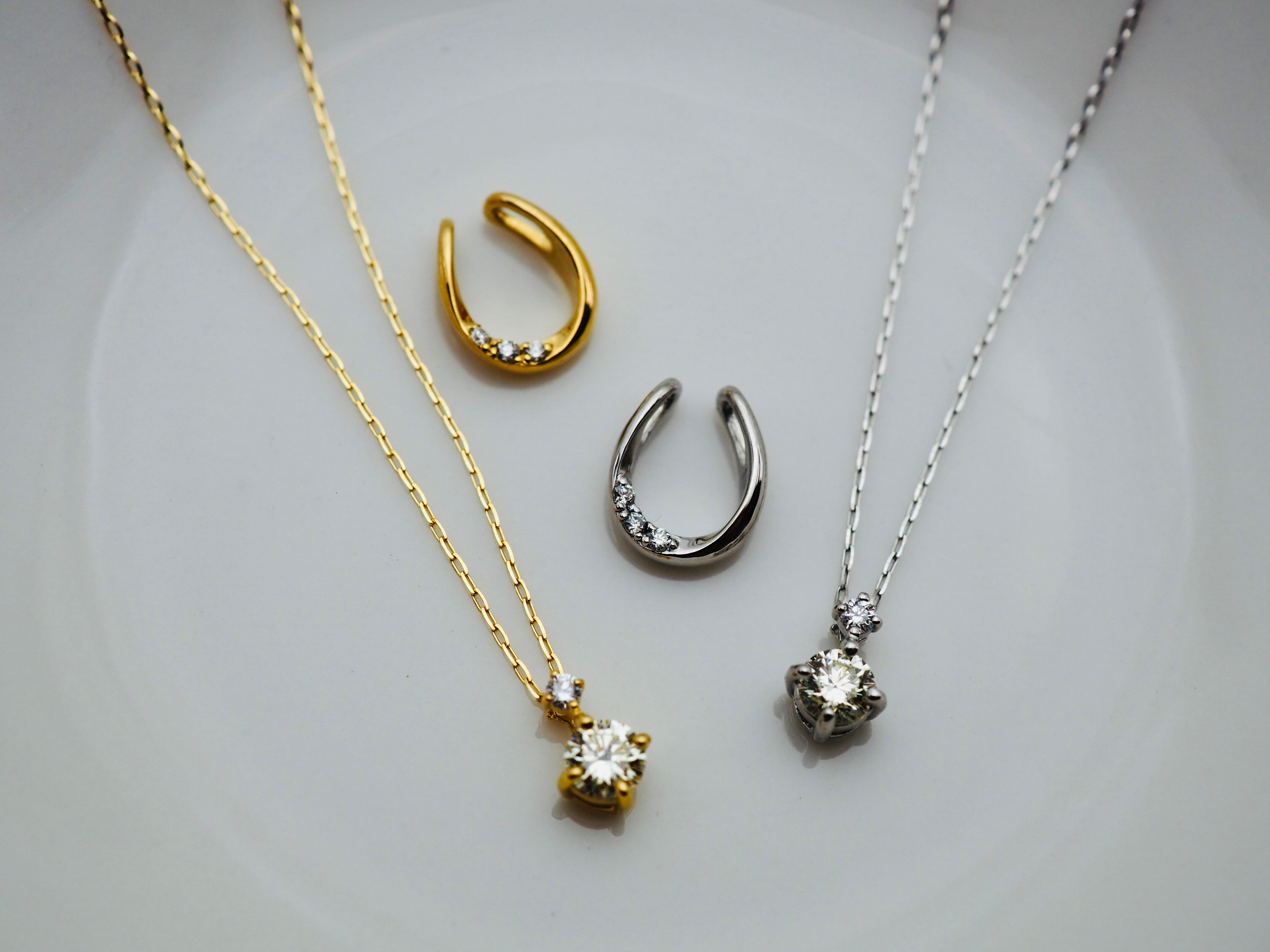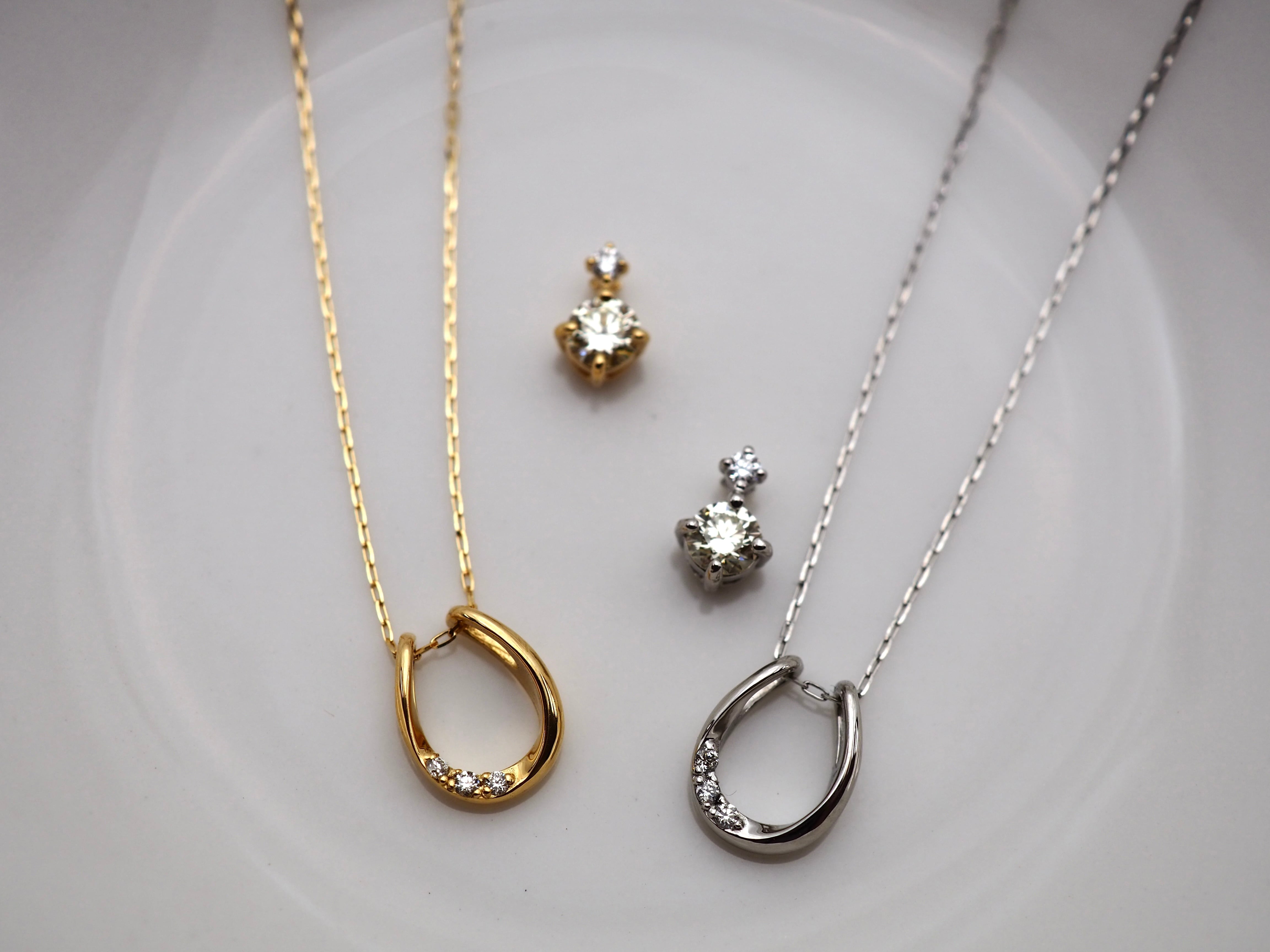 二粒ダイヤのプチネックレスとしても、馬蹄ネックレスとしても、また二つを合わせてのご使用も、組み合わせ自由の3wayタイプのネックレスになっております。色んな使い方ができるのでプレゼントにも喜ばれるジュエリーです。