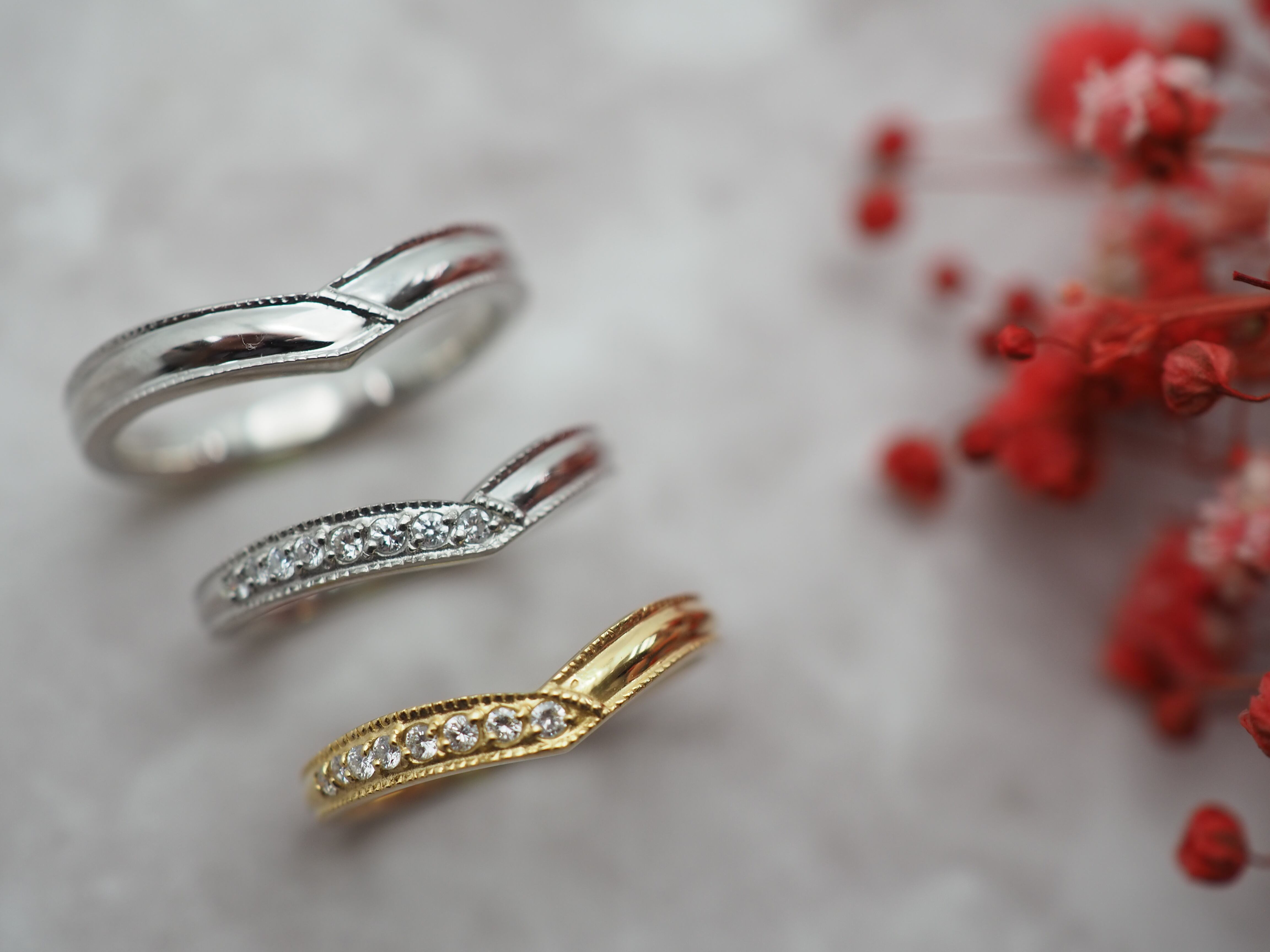 ダイヤtypeは片側にダイヤモンドを留める事によって、様々な角度で色々な雰囲気を楽しめます。