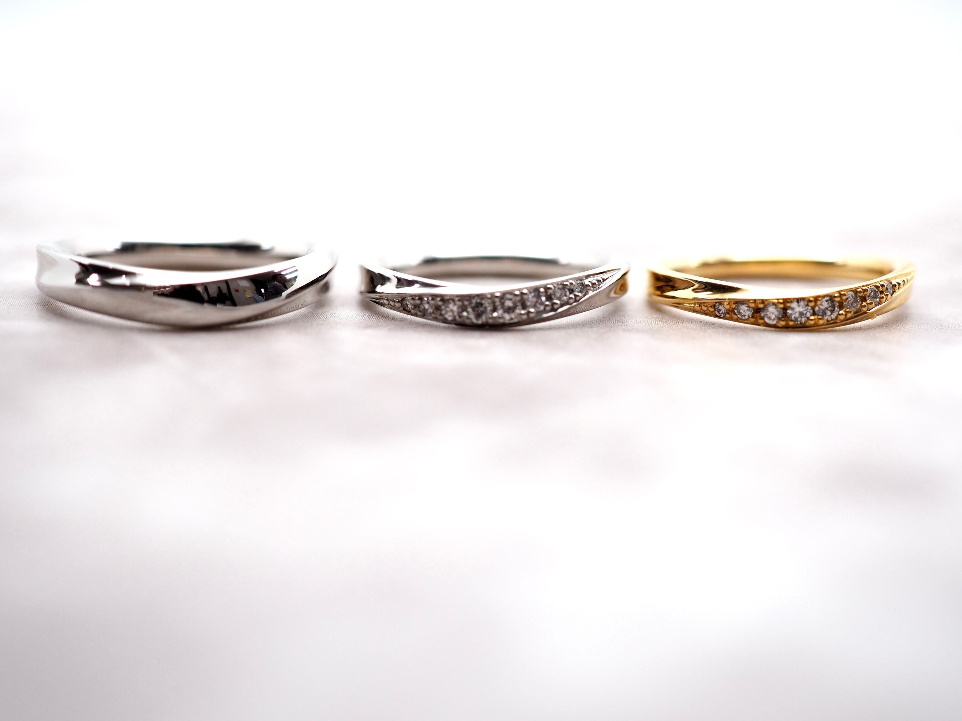 ウエーブデザインのダイヤモンドtypeはグラデーションになっているので角度によって色んな表情を魅せてくれ、地金typeも腕がしっかりしているので男性にも親しまれるデザインになっております。