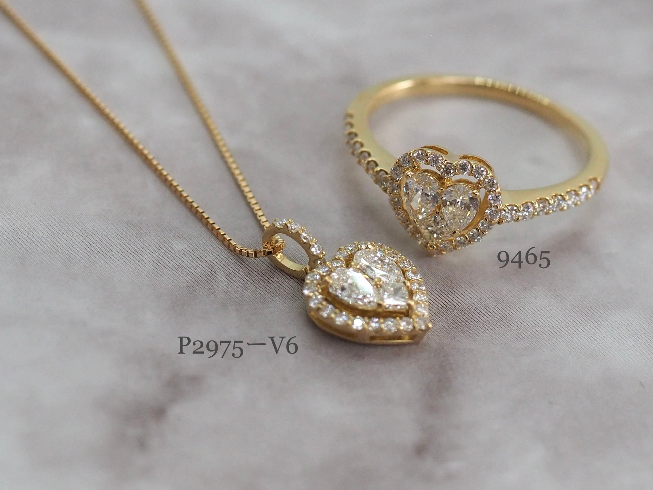 ツユ型のペアシェイプカットとプリンセスカットのダイヤモンドでハートを形どり、贅沢にもラウンドダイヤで取り巻きました。