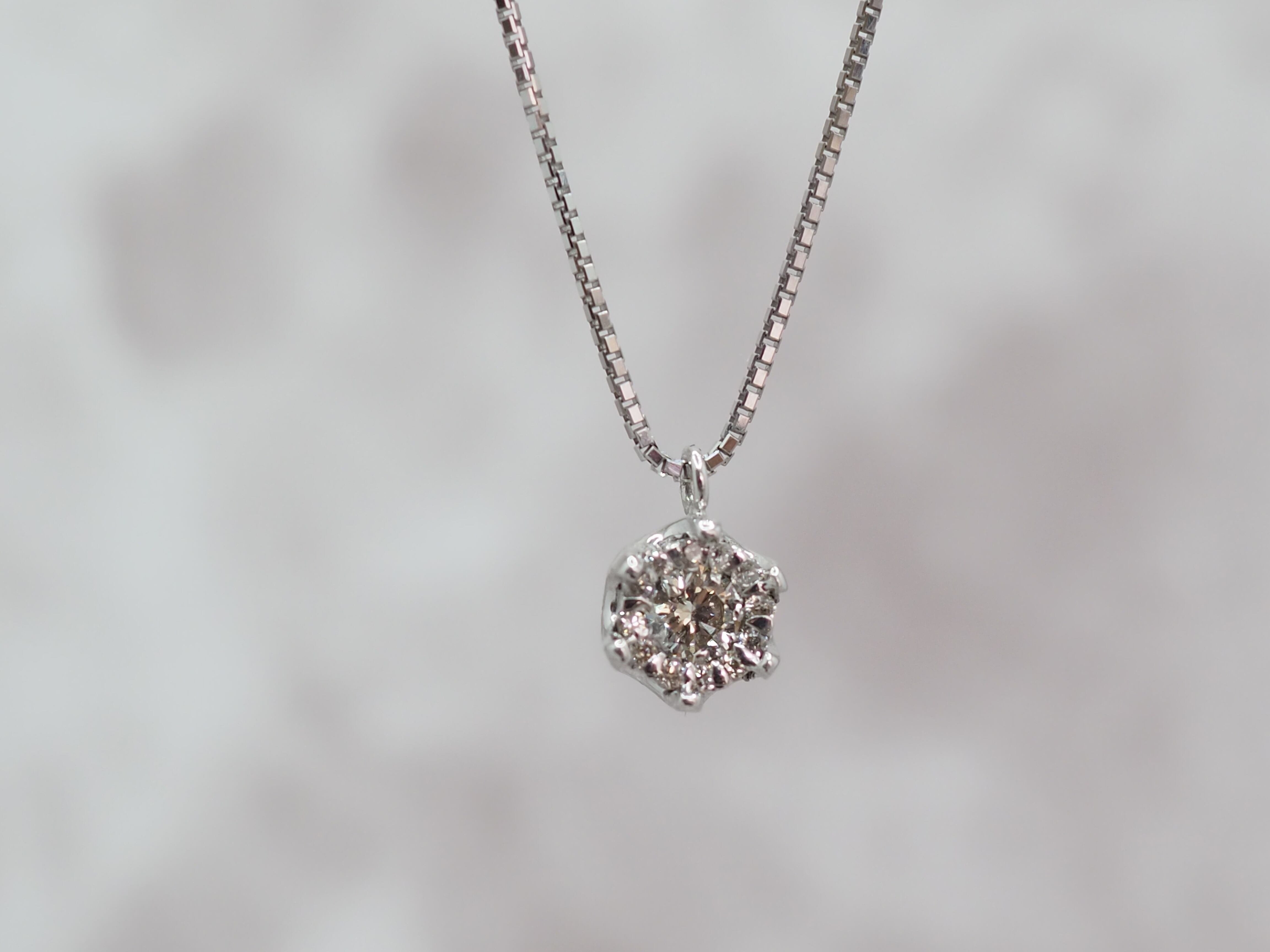 13ピースのダイヤモンドを使用していますが、6本爪の大きな1粒ダイヤモンド風のペンダントに仕立てました。