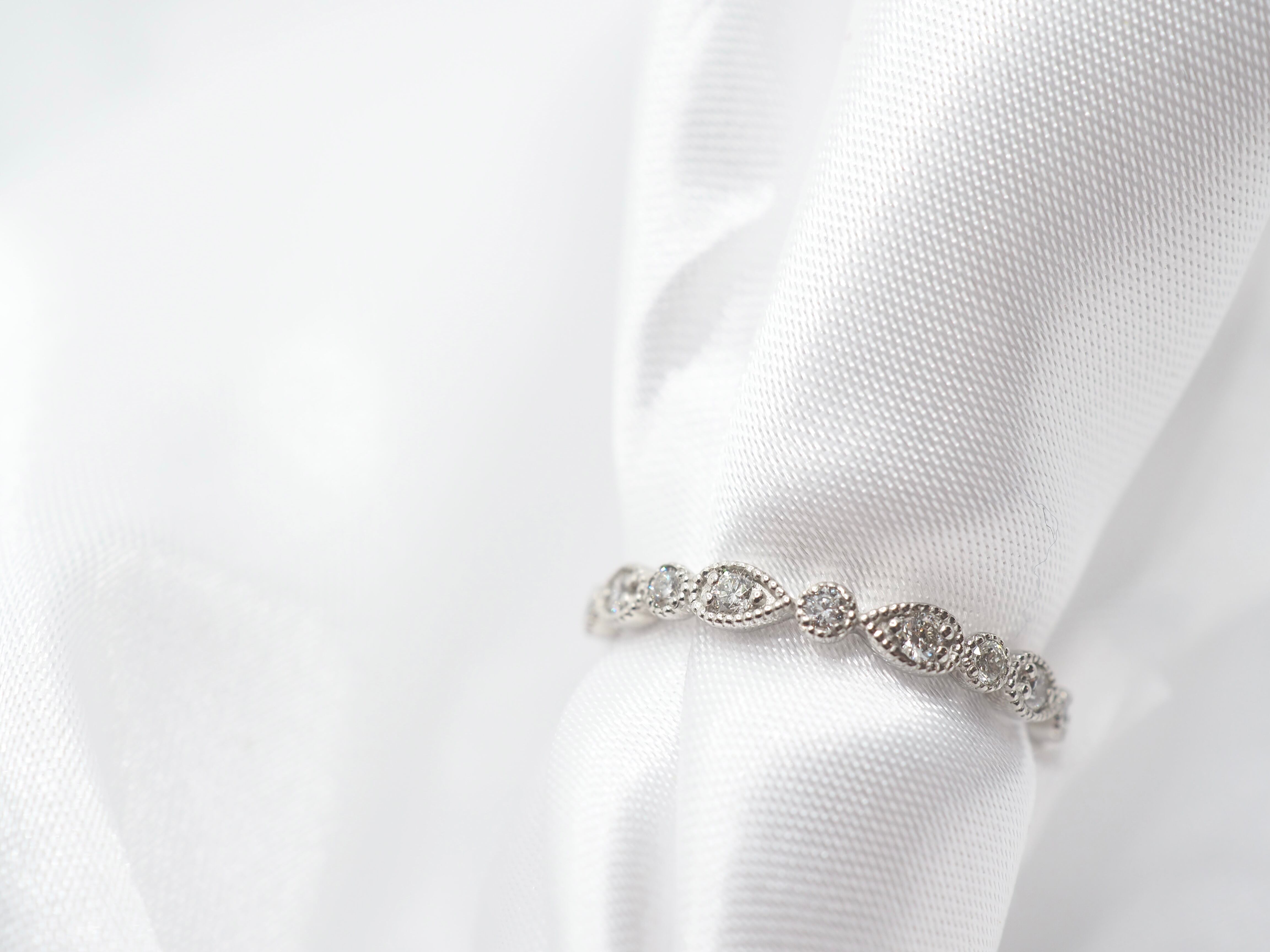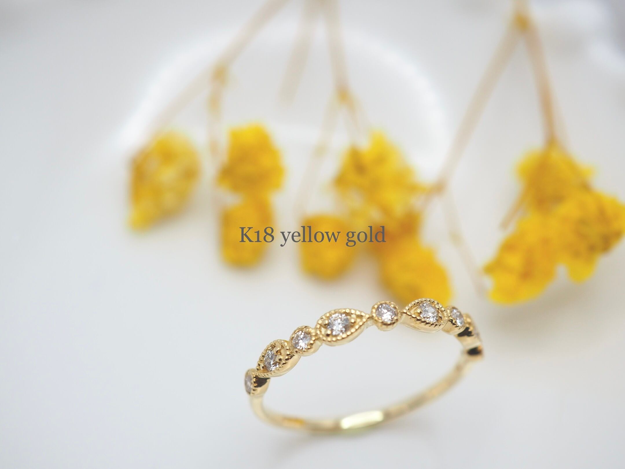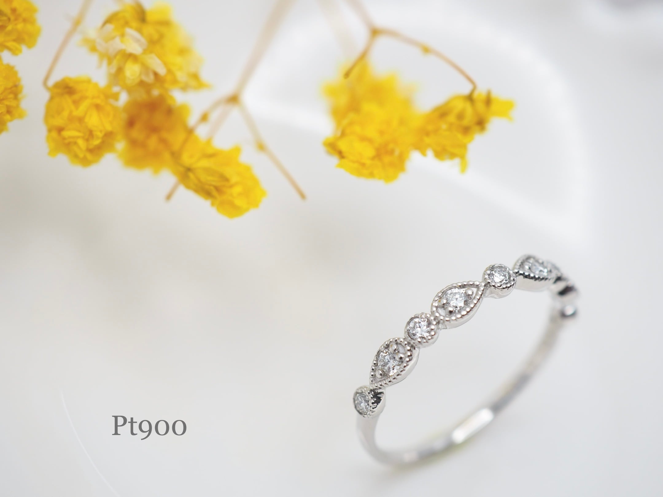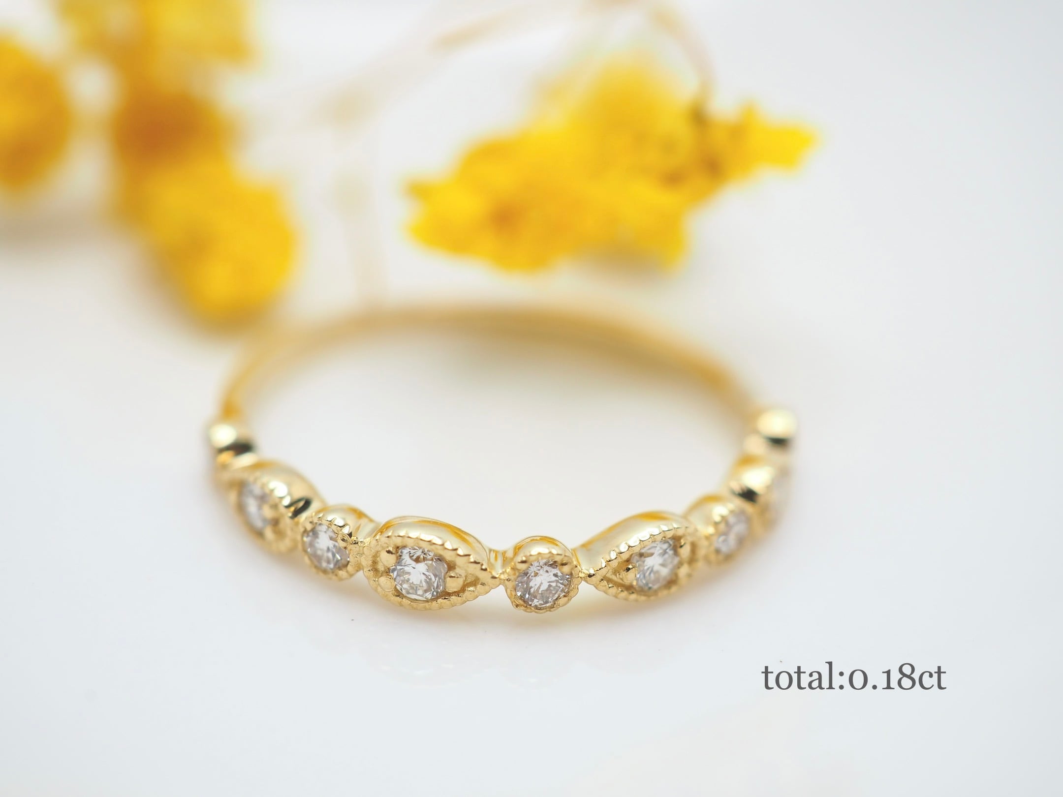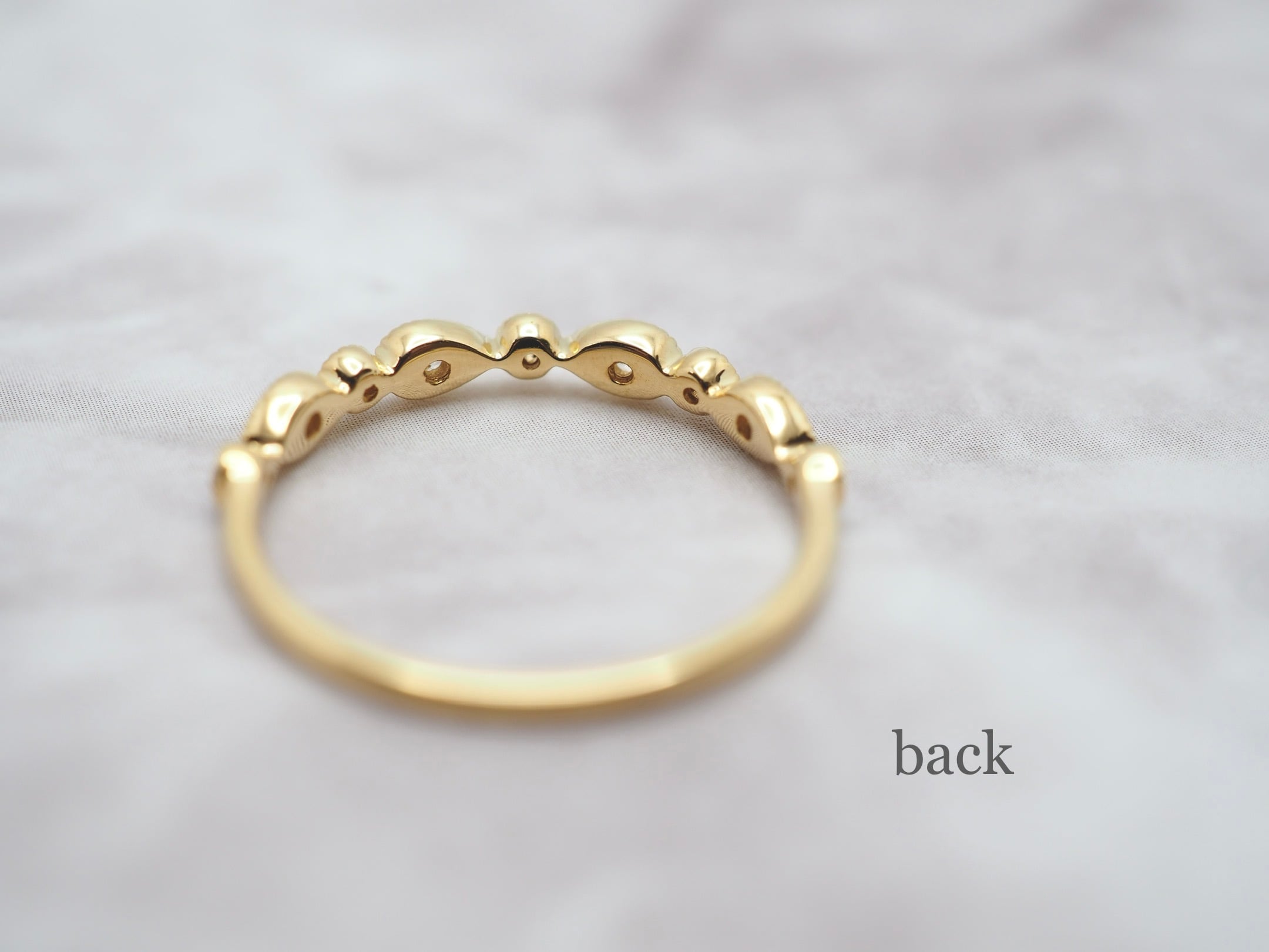 丸型とツユ型が交互に置かれたアンティーク調のおしゃれなリング。周りをミル打ち加工しているので、よりくっきりしたデザインになっております♩